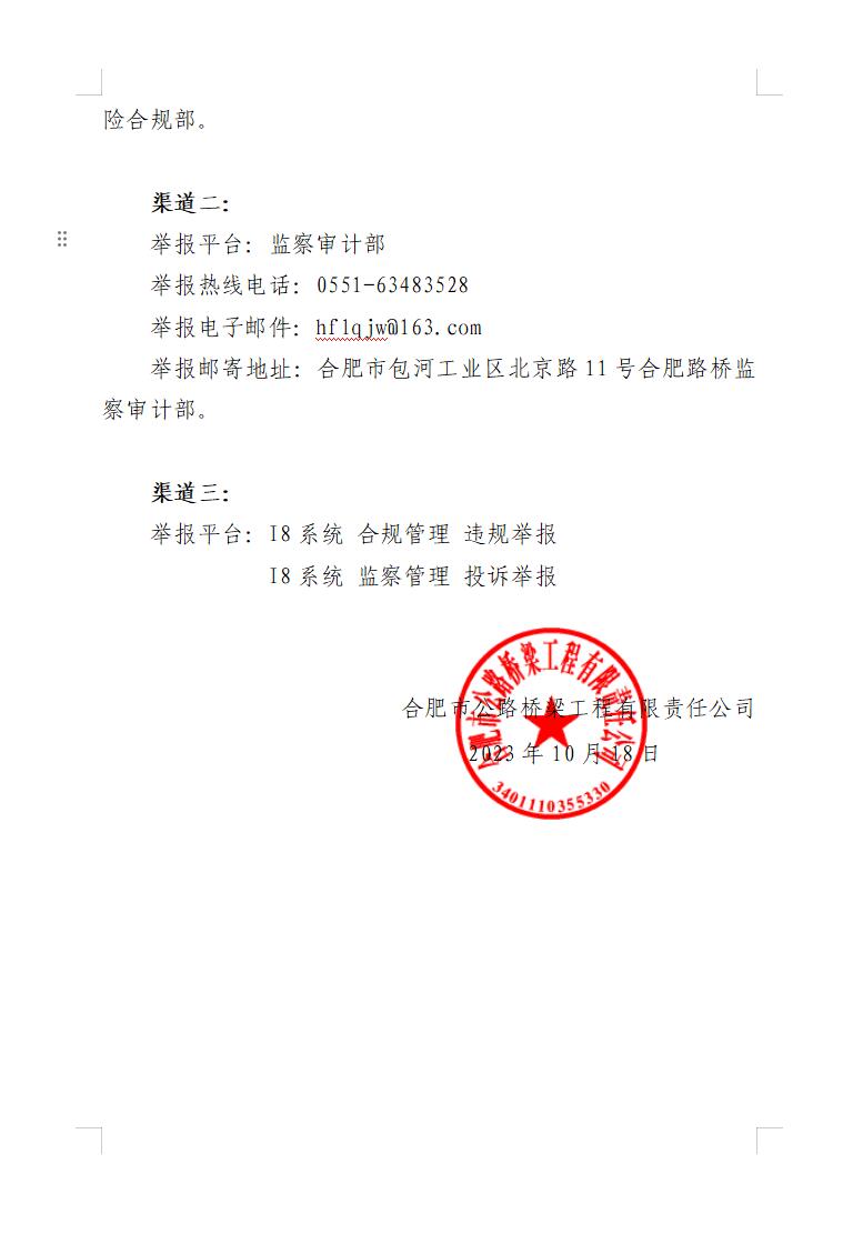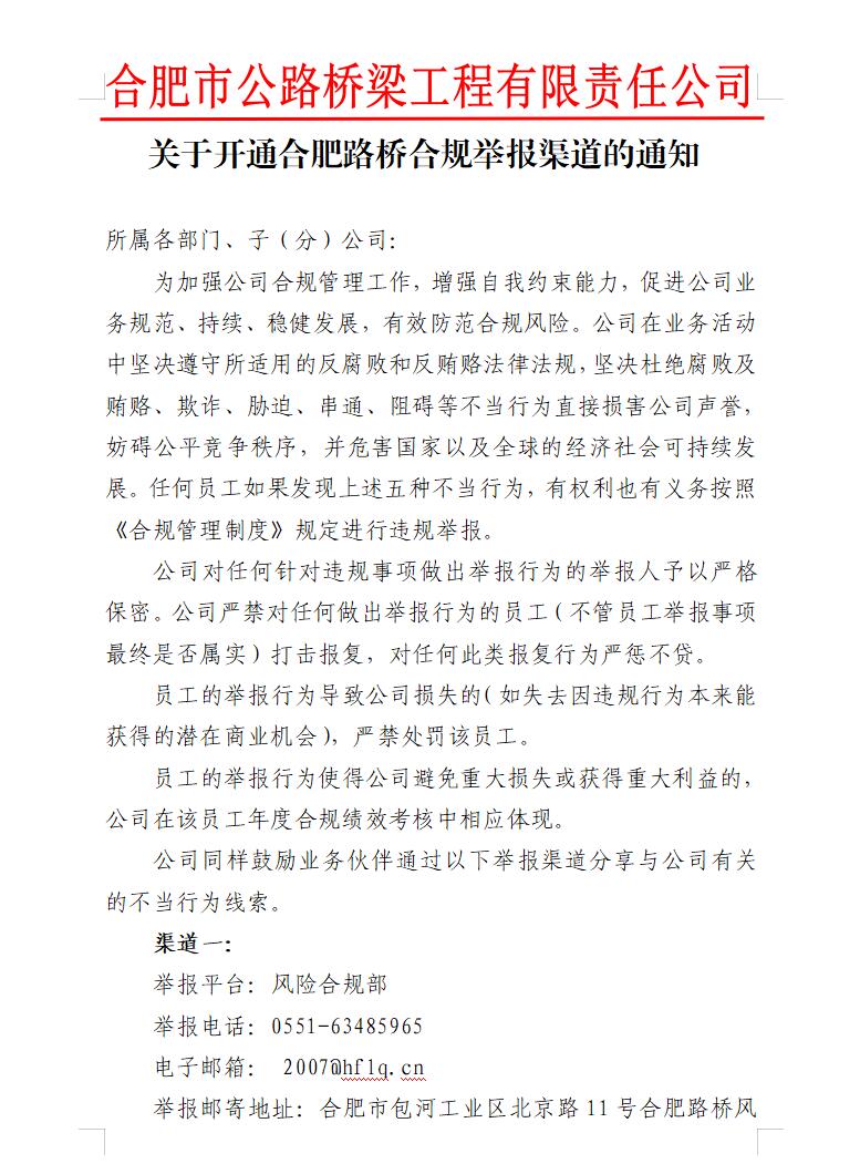 關于開通合肥路橋合規(guī)舉報渠道的通知