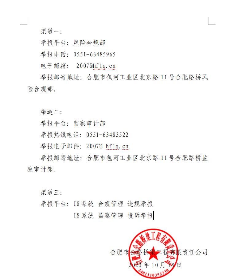 關(guān)于開通合肥路橋合規(guī)舉報(bào)渠道的通知