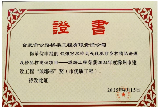 日前,滁州市住房和城鄉(xiāng)建設(shè)局、滁州市交通運(yùn)輸局、滁州市水利局聯(lián)合公布了2024年度滁州市建設(shè)工程“瑯琊杯”獎獲獎名單。合肥路橋承建的 江淮分水嶺天長段美麗鄉(xiāng)村精品路線及精品村建設(shè)項目(二期)道路工程項目榮獲2024年度滁州市建設(shè)工程“瑯琊杯”獎。